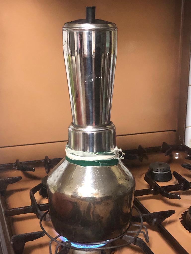 - Cover the cylindrical vessel and place it on top of the base vessel where the water should be boiling by now.