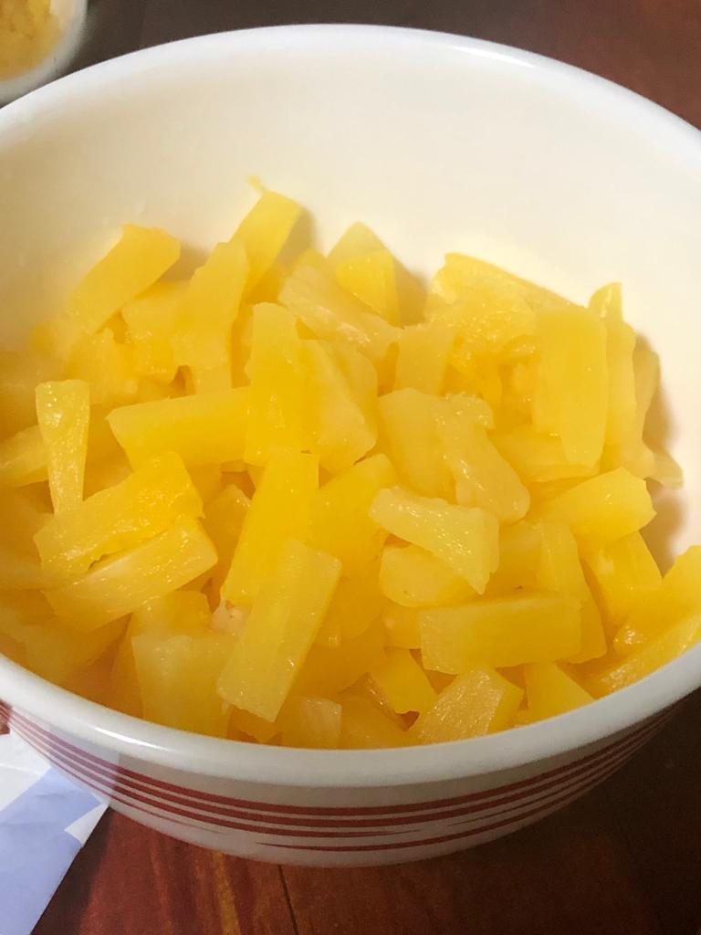 - Drain the syrup from the can and cut the pineapple into small pieces.