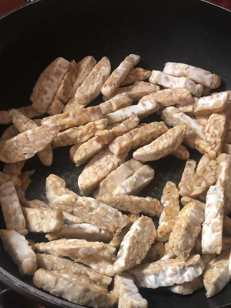 - Now add the fried tempeh to the pan and toss until the tempeh pieces are fully coated.