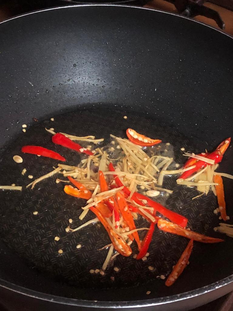 - Using the same oil, saute the red chilies for about 2 mins followed by the ginger strips.
