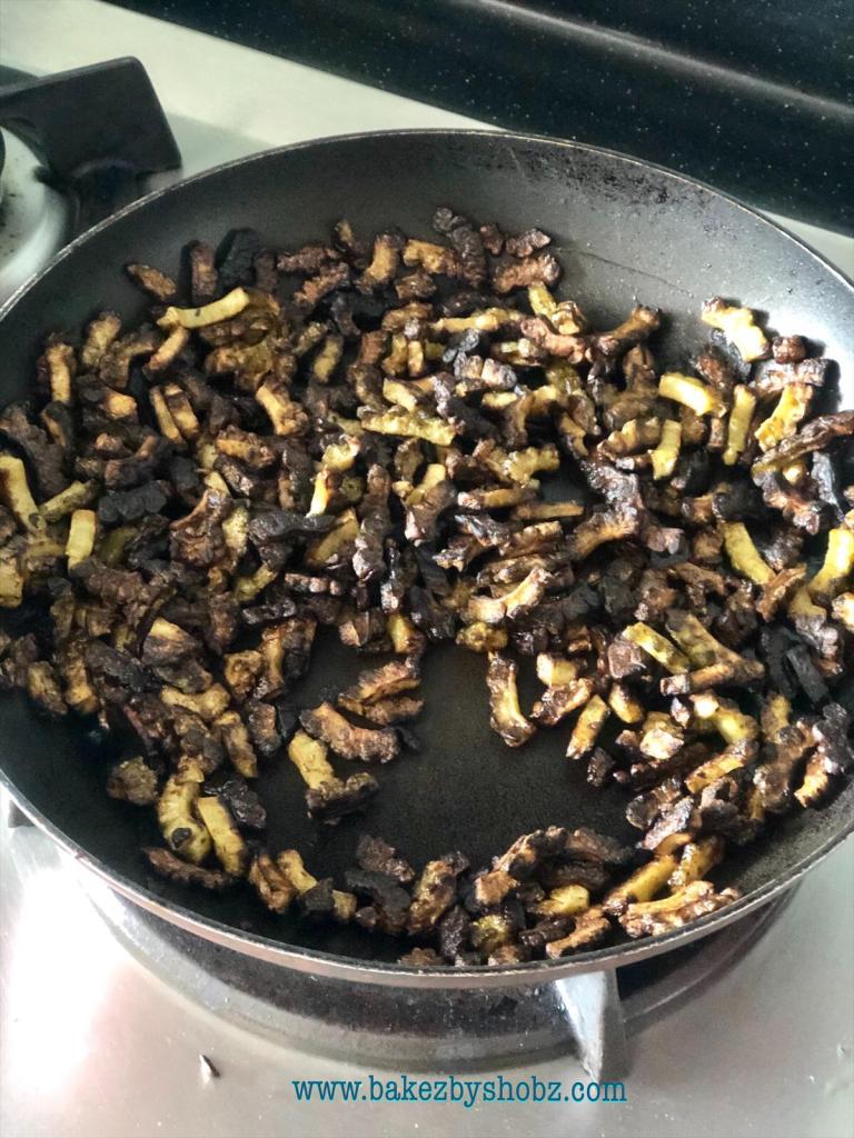 - Heat oil in a wok and when hot, squeeze the water out from the karela and fry the karela till brown. Remove and keep it aside.