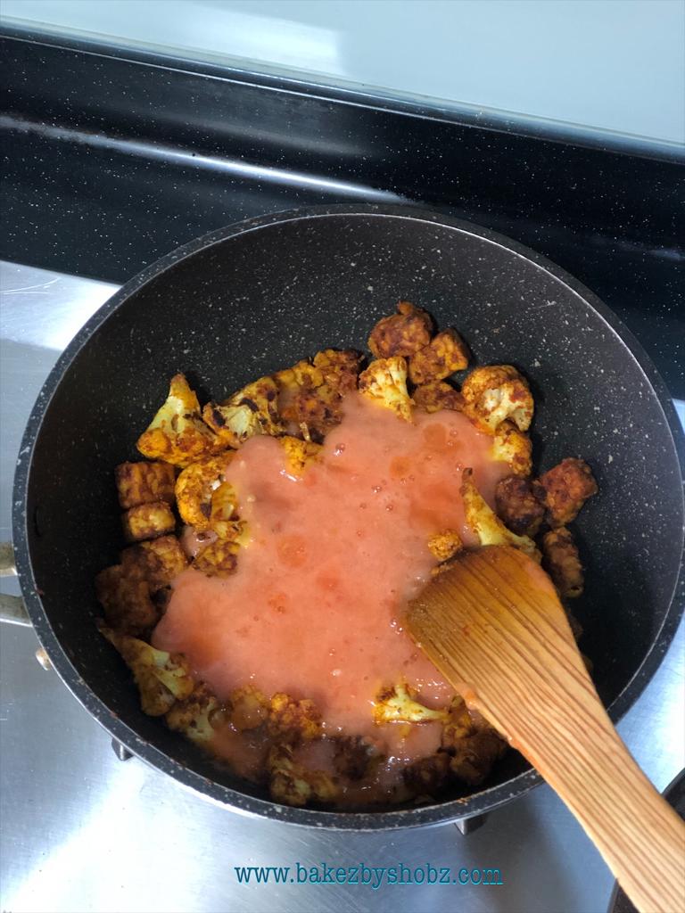 - Heat a pan with 2 tablespoons oil and add tempeh and cauliflower. Cook until brown. Add the minced ginger, garlic, cardamom powder, chilli powder and remaining spices. Toast until fragrant then add tomato purée.