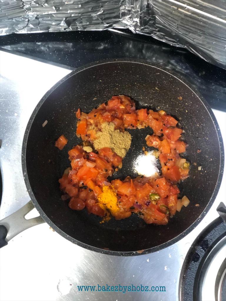 - Then add turmeric powder, chilli powder, coriander powder, cumin powder and salt and stir well. If it becomes too dry, add a little water.