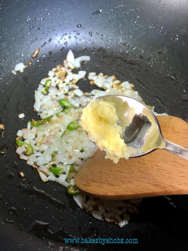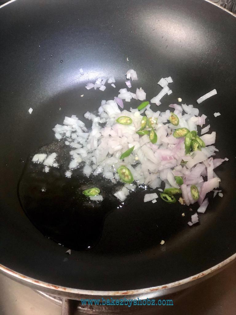 • In a wok, heat some oil and once it’s hot, saute the onions and green chilli for couple of minutes.