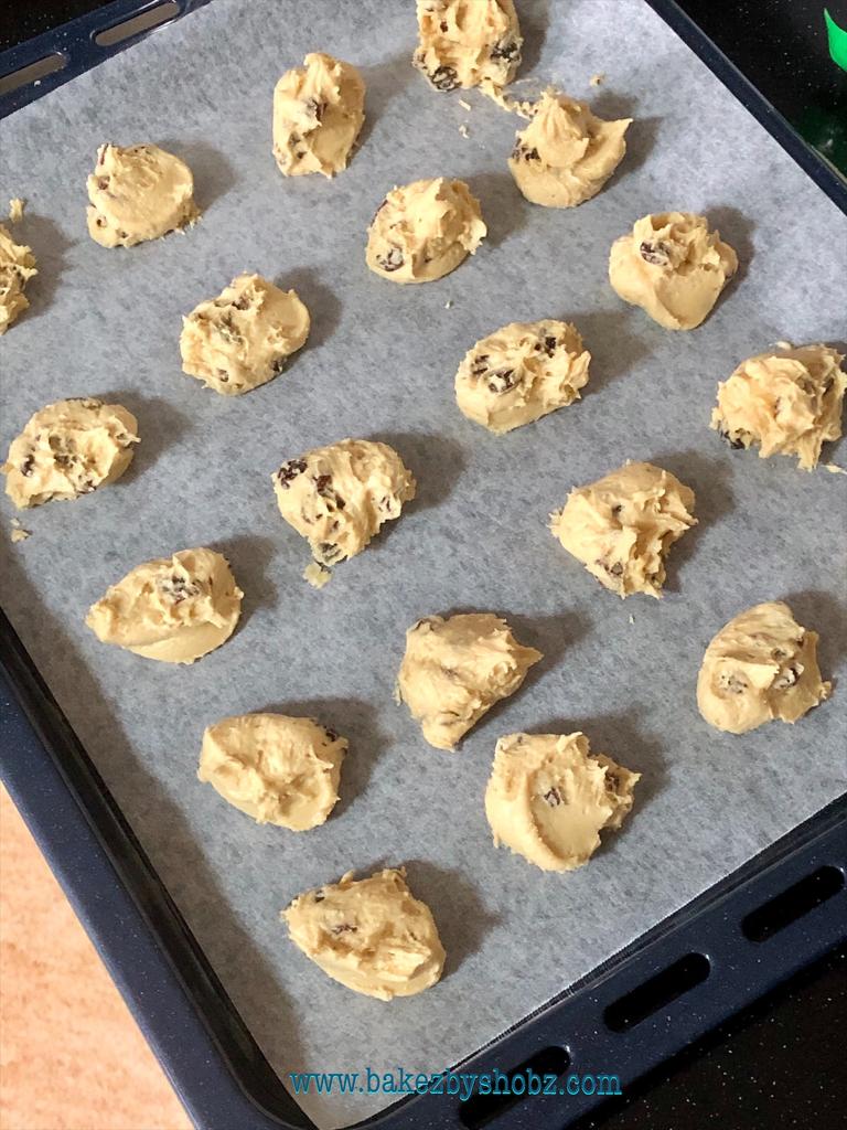 - For each cookie, drop about one tablespoon of batter onto the prepared baking sheet, spacing the cookies about 2 inches (5 cm) apart.