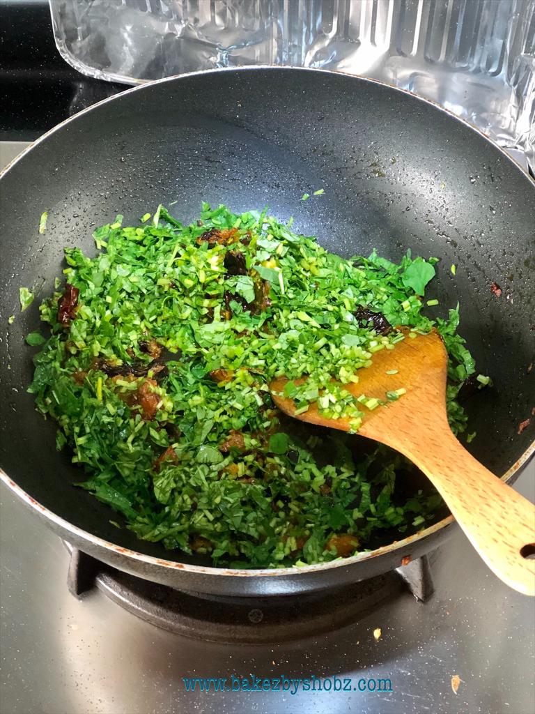 - Once the leaves have wilted, add the cooked dal and salt and stir well.