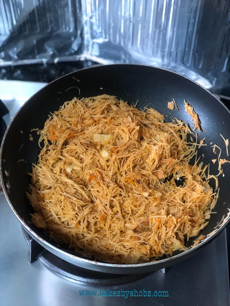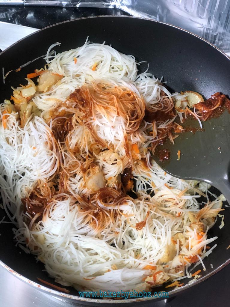 - Now add the bee hoon followed by the sauces and stir well till combined.
