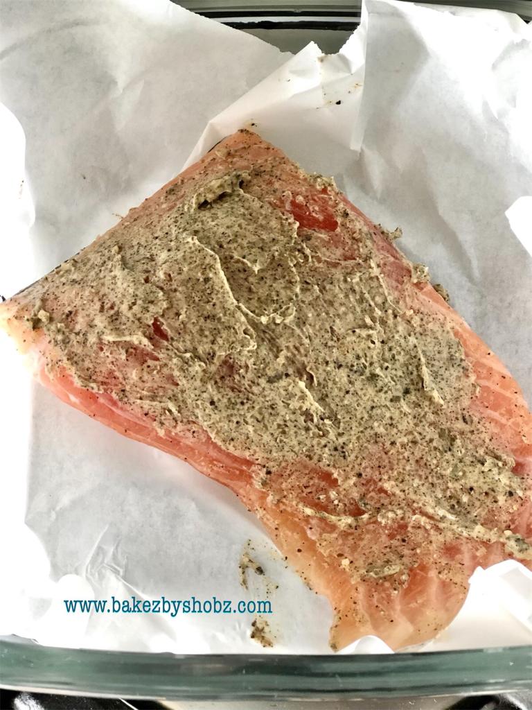 - Wash and pat dry the salmon and marinate with garlic butter, salt and crushed black pepper. Leave it aside for half an hour.Ā