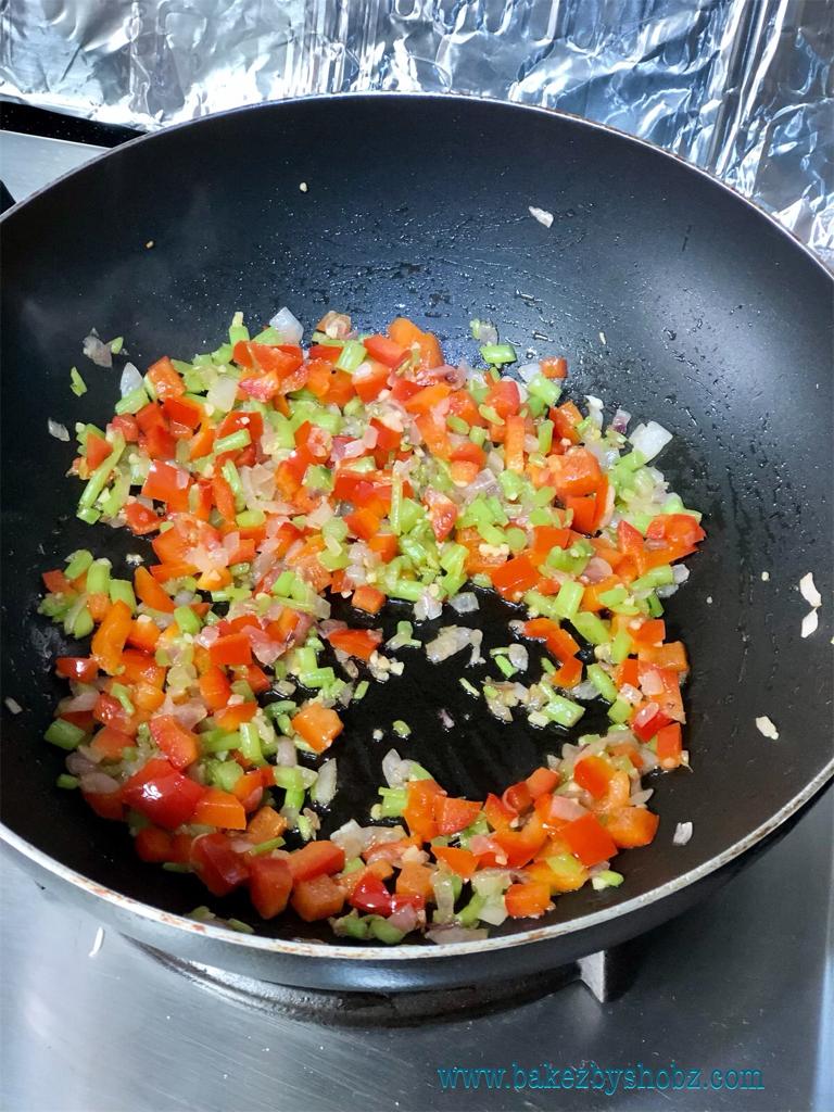- Next add the diced red bell peppers and the spinach stems and let it cook for couple of mins.