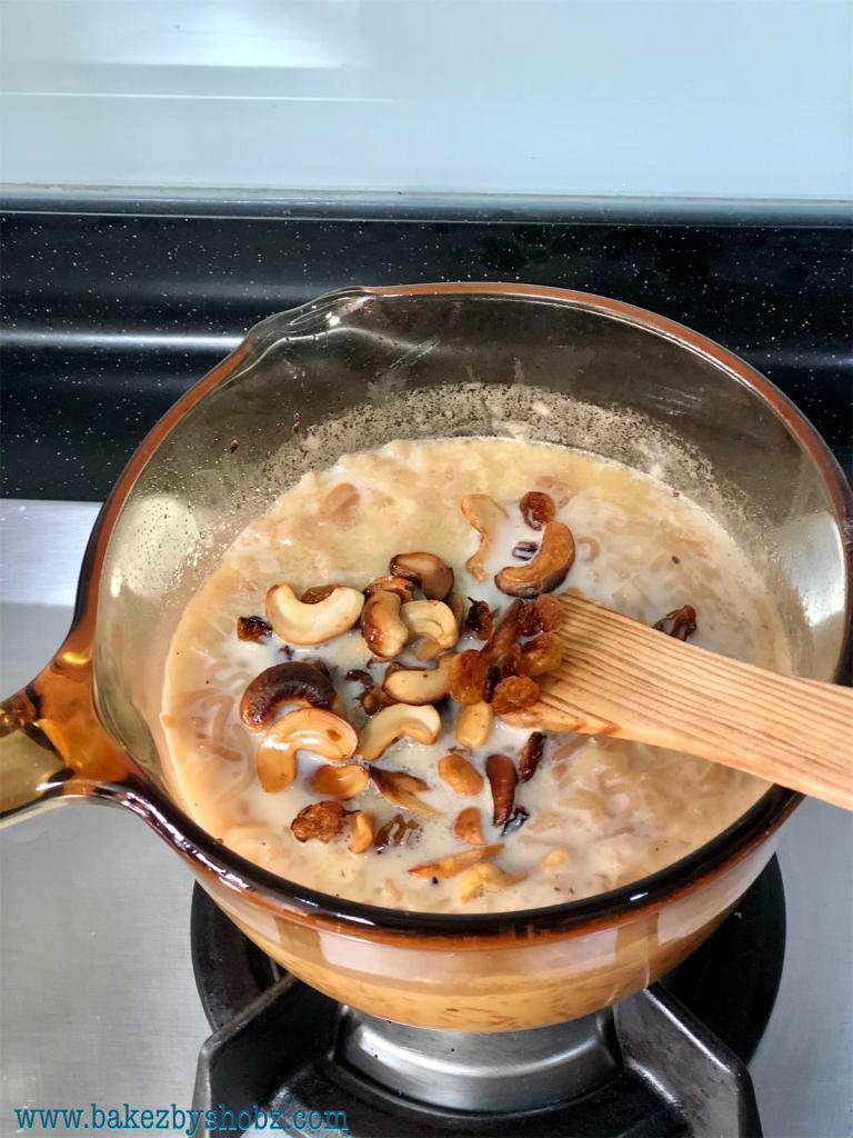 - Lastly add the crushed cardamoms, cashew nuts and raisins.