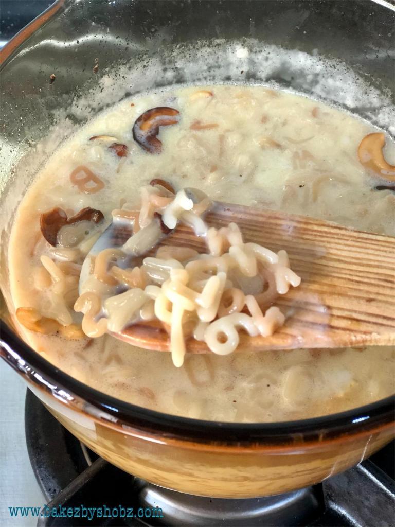 Payasam is an Indian desert usually made by boiling rice or vermicelli with milk, sugar and flavoured with cardamom. There are so many other variants besides rice and vermicelli that can be used and for this recipe I’ve used the alphabet pasta.