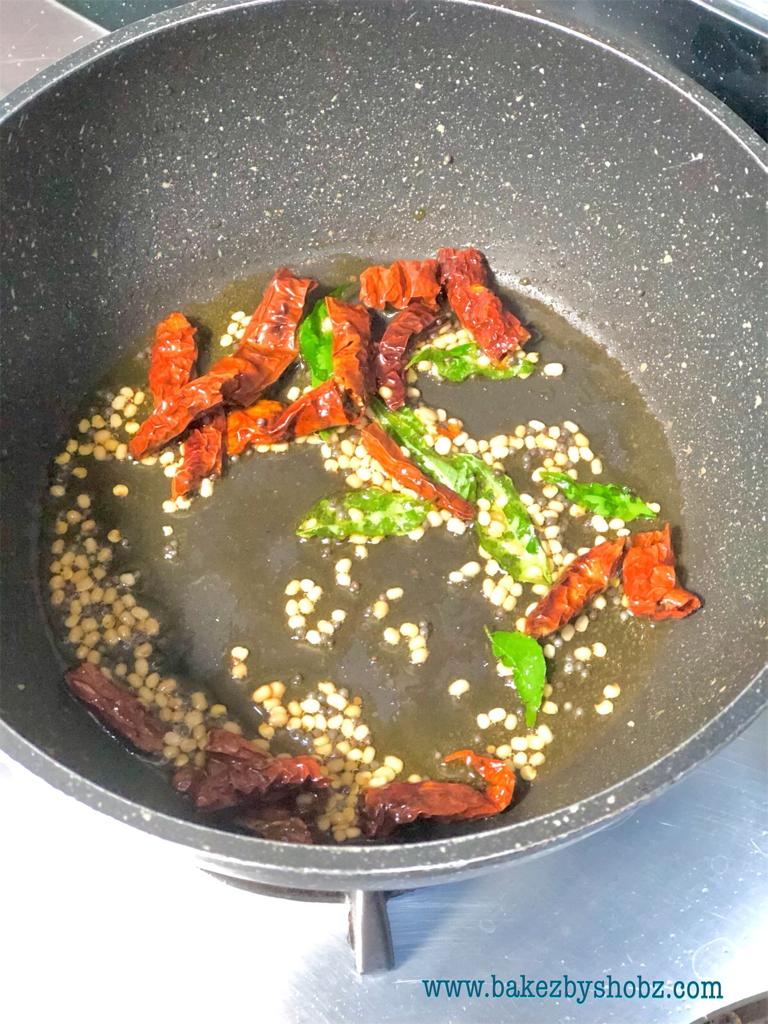 - In a small wok, heat a little oil and when hot, add the mustard seeds and let it splutter.