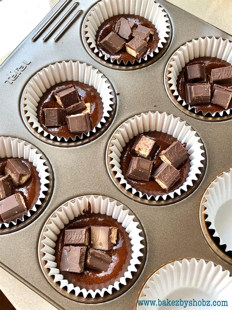 - Using an ice cream scoop, pour the batter into the paper cups halfway. Place 4 small cubes of the Kit Kat cholate then top with remaining batter. Place 2 or more pieces of the Kit Kat chocolate on top of the batter.