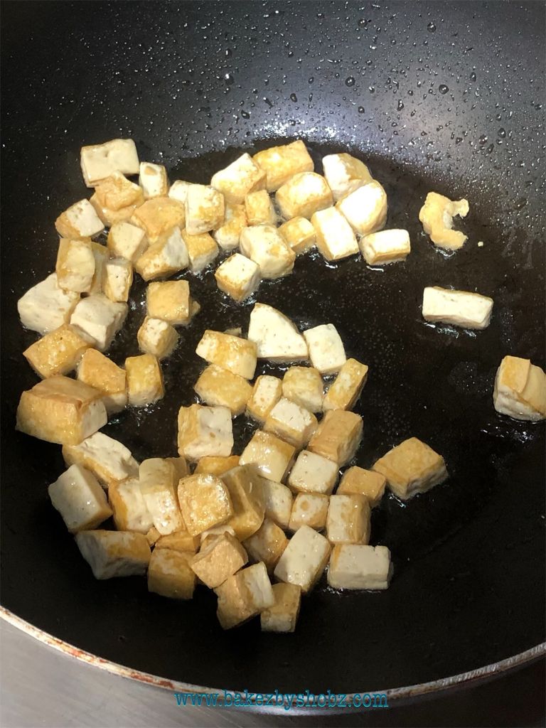 - In a medium wok, heat a little oil and once hot, pan fry the tofu till golden brown.