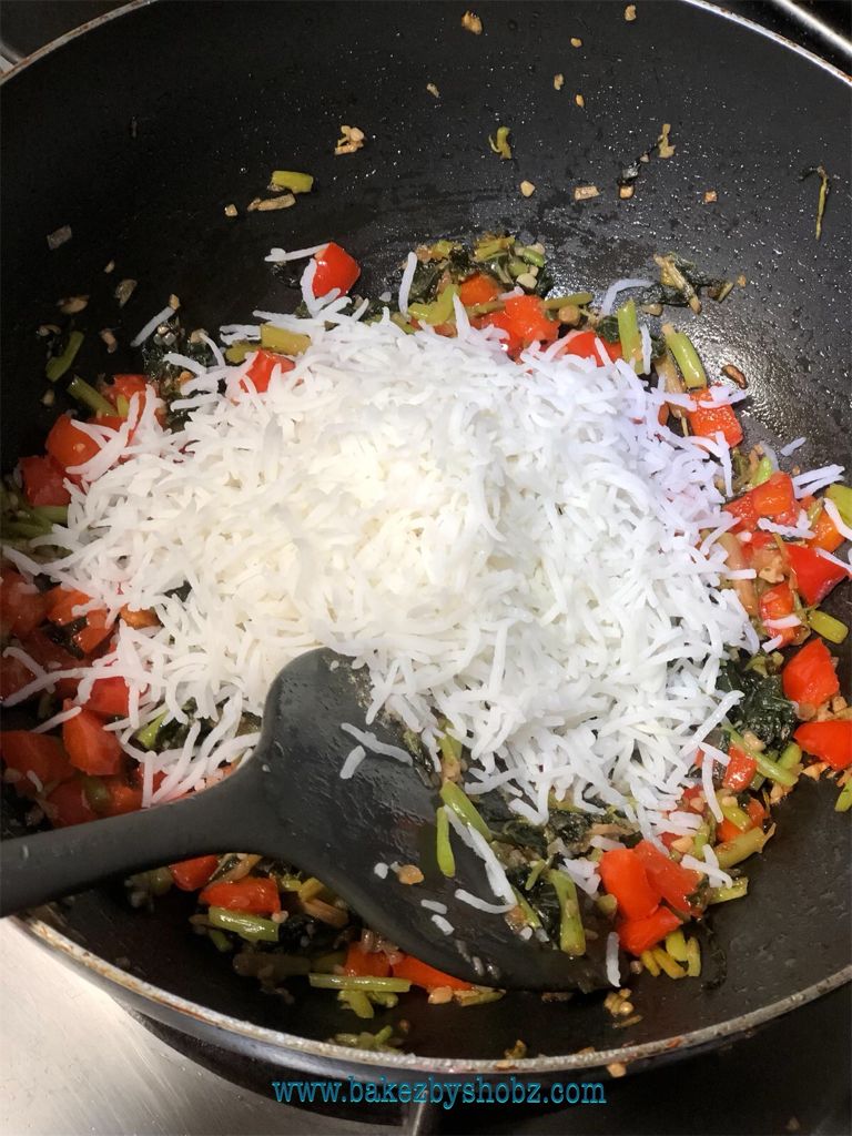- Now add the cooked rice, salt and pepper and mix well to combine.