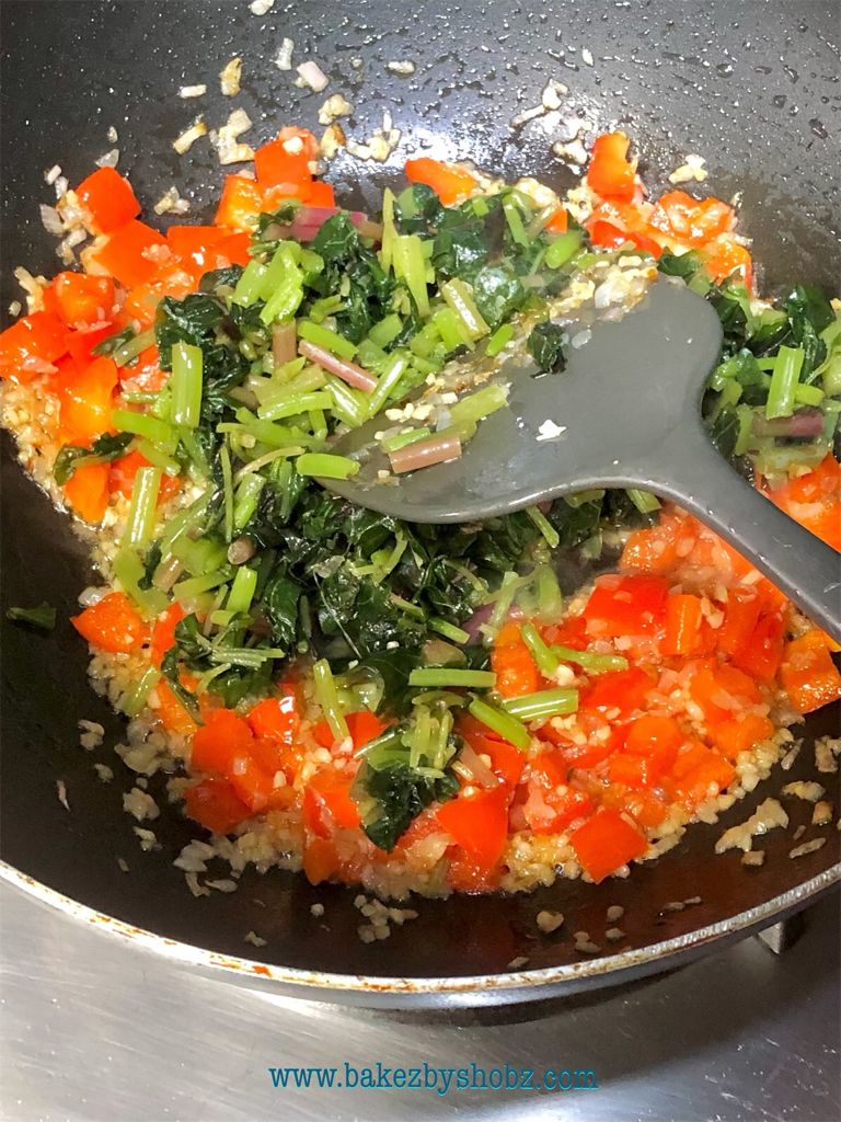 - When the bell pepper is 3/4 cooked, add the spinach and stir well.
