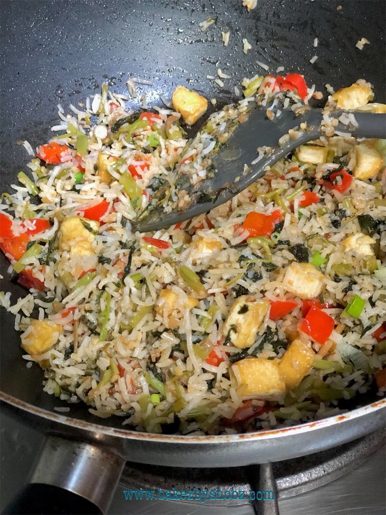 Here is a simple, quick, easy to make dish with left over veggies or if you like, you may even use frozen veggies. Typically you must add eggs when making fried rice, but as I wanted to make it vegan, I omitted eggs and added tofu instead.