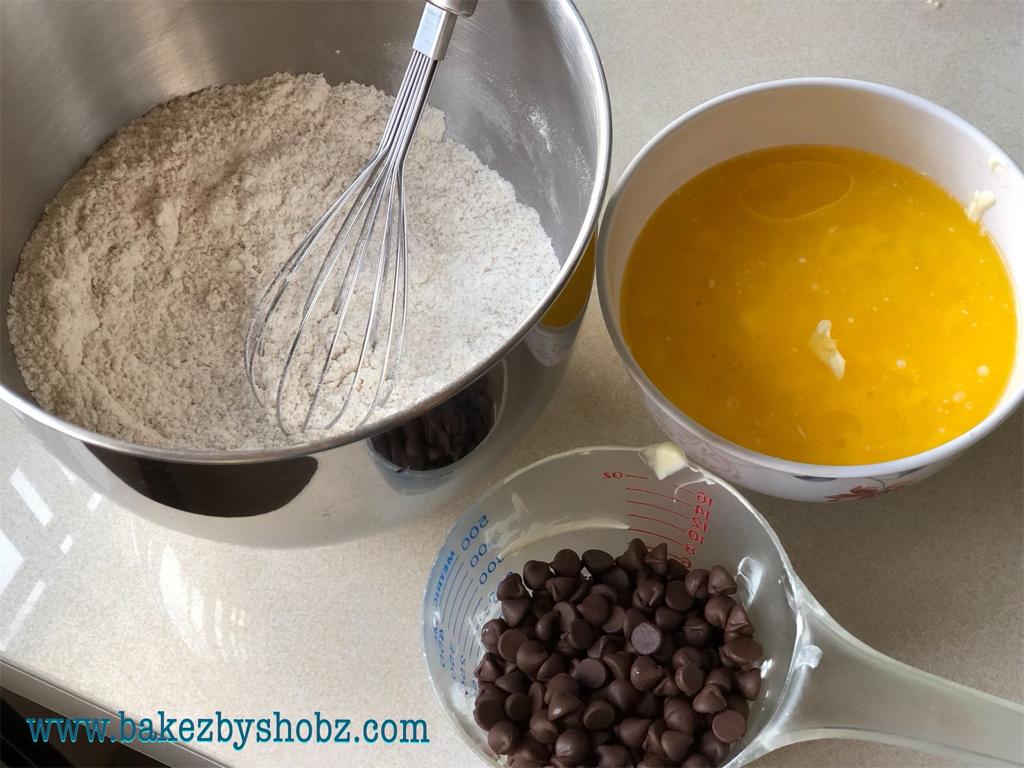 - Pour the wet ingredients to the dry ingredients and mix well, ensuring not to over mix and lastly fold in the chocolate chips.